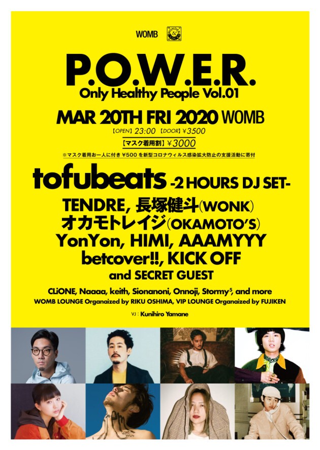 健康なアーティスト&健康な人たちのためのクラブイベント開催、tofubeats、TENDRE、WONKら出演!マスク着用来場1名につき500円がコロナ感染防止活動へ寄付される