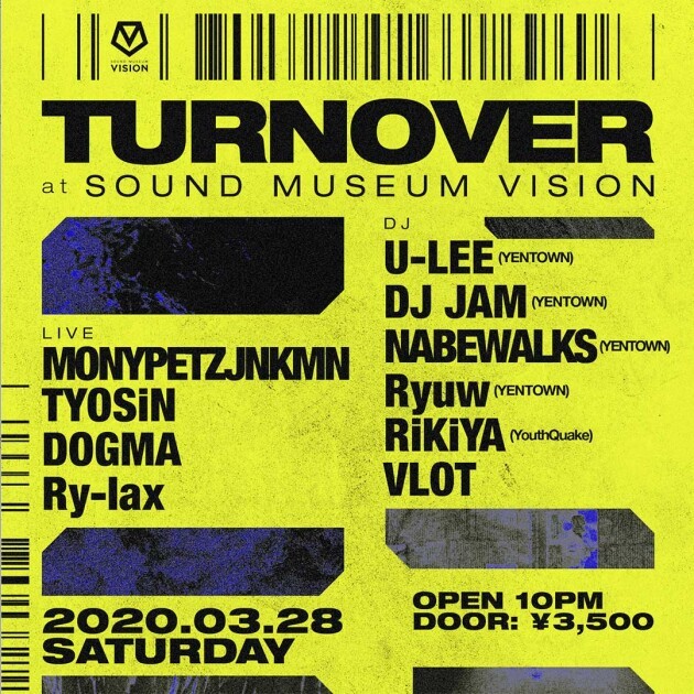 毎回、日本のHIPHOPシーンを牽引する豪華アーティストが出演し、VISIONのレギュラーパーティーとして不動の人気を誇る「TURN OVER」1stアルバム『磊』で話題を呼んだMONYPETZJNKMNとTYOSiNがメインに登場!