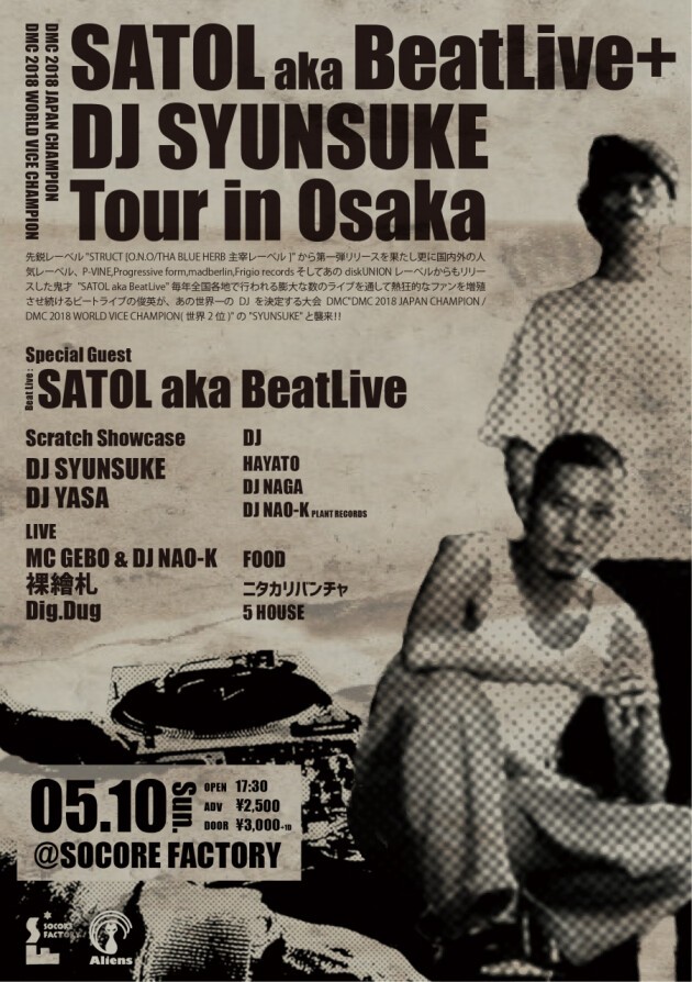 先鋭レーベル “STRUCT (O.N.O/THA BLUE HERB主宰レーベル)” から第一弾リリースを果たし更に国内外の人気レーベル、P-VINE,Progressive form,madberlin,Frigio recordsそしてあのdiskUNIONレーベルからもリリースした鬼才”SATOL aka BeatLive” 毎年全国各地で行われる膨大な数のライブを通して熱狂的なファンを増殖させ続けるビートライブの俊英が、あの世界一のDJを決定する大会DMC”DMC 2018 JAPAN CHAMPION / DMC 2018 WORLD VICE CHAMPION(世界2位)”の”SYUNSUKE”と襲来!!