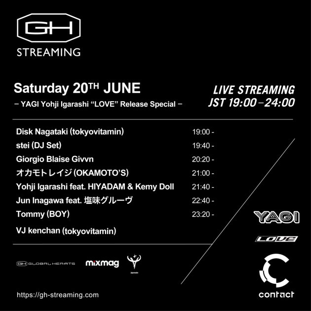 Reiji Okamoto (OKAMOTO’S) hosts his first online version of YAGI, a series he has been curating across the nation. YAGI ~Yohji Igarashi “LOVE” Release Special~ will be celebrating Yohji Igarashi’s 2nd EP「LOVE」which was released on 5/27. HIYADAM & Kemy Doll, whom have recorded on the track「Empty Room」on the EP, will be joining Yohji’ as his featured DJs. DISK NAGATAKI from tokyovitamin, Giorgio Blaise, stei, JUN INAGAWA feat. 塩味グルーヴ(Shio-aji Groove), and TOMMY (BOY) will also be joining the lineup.