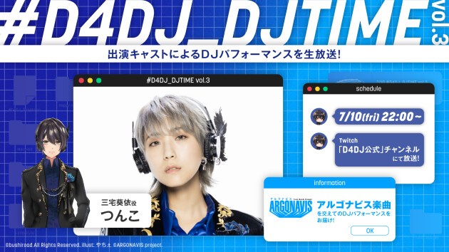 ユニット「燐舞曲」の三宅葵依(みやけ あおい)役、つんこ が出演。D4DJのオリジナル楽曲やカバー楽曲に加え、 「ARGONAVIS from BanG Dream!」の楽曲も交えてDJパフォーマンスを披露。そのパフォーマンスを生配信で楽しもう!