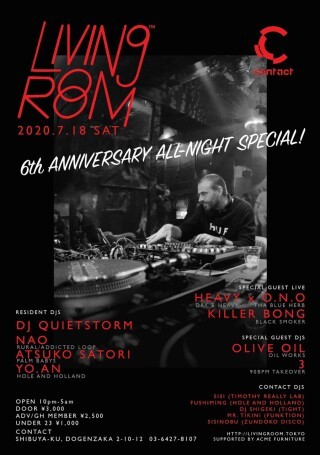 The monthly party LIVING ROOM™️ , held on the first Tuesday of every month where guests invited by DJ Quietstorm play while sitting on a sofa, celebrates their 6th anniversary for an all-night party on a Saturday.