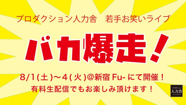 プロダクション人力舎の若手芸人による定期ライブ「バカ爆走!」8月公演が劇場にて開催決定!