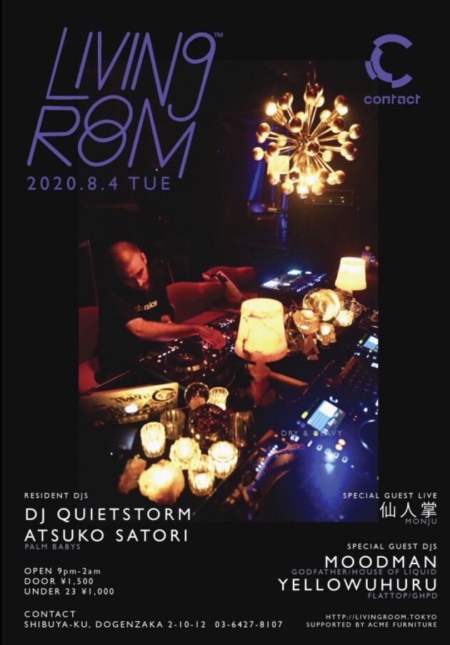 Organized by DJ Quietstorm, Nao, ドミンゴ企画 (Domingo Kikaku), and KEEE! hosts their regular party on the first Tuesday of every month, LIVING ROOM™ (https://livingroom.tokyo/).