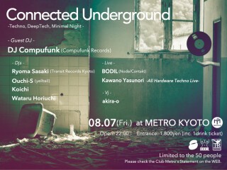 Currently he is playing in an underground techno/house party『Connected Underground』,『Deep Underground』,『yelltail』, all held in "Kyoto Metro" that is legendary night club in this historical city.