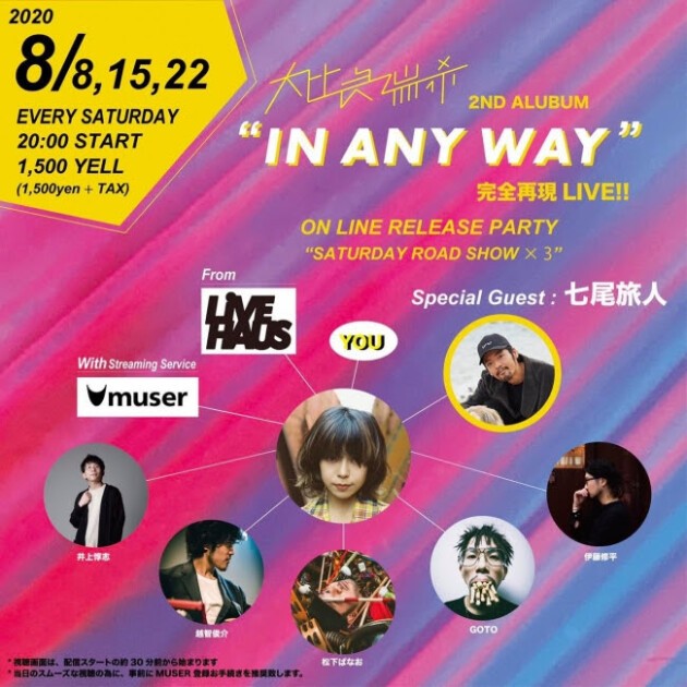 7/11(土)に無観客で収録されたライヴ映像が、8/8・15・22の土曜日に3週連続で配信。本編は同じだが、毎週異なるアンコール曲とインタビュー映像がボーナストラックとして追加される。さらには、毎回配信時に大比良瑞希本人とバンドメンバー1人がチャットに参加。アーティストとファンが一緒にリアルタイムでチャットしながらライヴを楽しめる。尚、チャットの参加にはYELL(エール)と呼ばれるMUSERのデジタルマネーが必要となる。