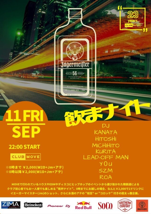 0時までにお越しの場合、なんと¥2,000で2ドリンクにイエーガーマイスター(Jm)のショット、さらにお酒のアテの "枝豆" or "コロッケ" 付きの超太っ腹企画。