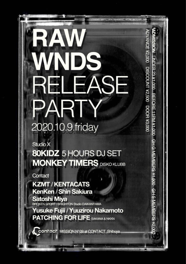 80KIDZ’s party, “MISSION”, that continues to break the scene’s boundaries hosts their 9th installment. This edition will be the release party of the streaming and cassette tape EP series「RAW WNDS MIXTAPE」. 5 hour DJ set by 80KIDZ, DISKO KLUBB organizers MONKEY TIMERS, KZMT and KENTACATS from the popular party EDGE HOUSE, bassist KenKen, and a DJ set by producer/guitarists Shin Sakiura are just a few among the many to be featured this evening.