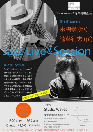 かつてハービー・ハンコックなど世界の超一流ミュージシャンたちとも共演した日本を代表するジャズベーシスト水橋孝と、現在「源氏物語54帖の響」プロジェクトを手がける人気ピアニスト遠藤征志による豪華なLive&Session!