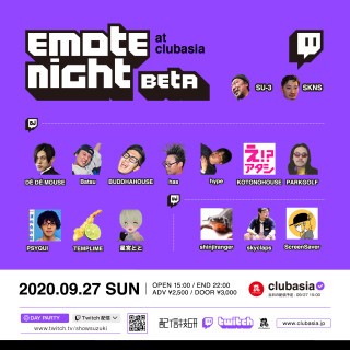 数々の名パーティーを配信してきた『ShowSuzuki』 Twith ChannelのEmote(スタンプ)アーティストをお呼びして開催される「EMOTE NIGHT」。今回は昨今のコロナ感染症対策として出演者も絞り、初のオフライン / オンラインでテスト開催β(ベータ)版!オンラインでのアーティスト出演時間では是非EMOTE!オフラインでも是非ご体験ください!