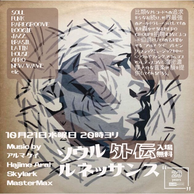 比類なきレコードへの追求を今なお続け、世界最強のアーカイヴ・レーベルとしてその名を轟かせるNUMERO GROUPを招聘するなど、レコード伯爵として一部の間でしられるレコード伯爵こと、 "アルマ ケイ" プレゼンツ。ブラックミュージックを中心にソウルやファンク、アフロ、ゴスペル、ディスコなど濃密濃厚ナイトな音楽体験を提供してくれるだろう。