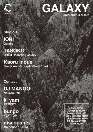 Galaxy is the most well-known high quality Techno party in Okinawa amongst dance music fans. Now based in Tokyo, IORI is the man behind the Galaxy who has made his name in Berlin and around the world. Galaxy will be hosting its first party at Contact, a first of a 3 month consecutive series, in celebration of IORI’s new label〈VISIONARY〉and the release party of Tasoko’s unit Blue Fiction from the label who will be performing in Studio X.