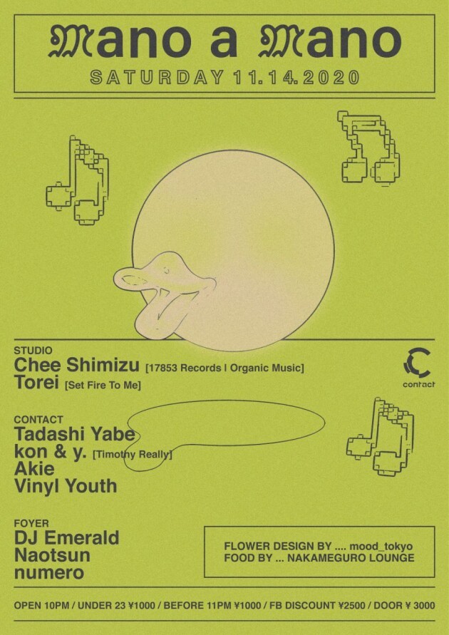 Contact floor for this edition of mano a mano is also worth a great deal of attention. Tadashi Yabe, taking in music from around the world and creating his own funkness and coolness as UFO, is one of the top artists who pursued music in a different direction in contrast to the two artists in the main floor. Vinyl Youth, a crew that has a deep affection for the sound of records, makes their first appearance with their cosmic and Balearic sounds. The Deep Disco unit kon & y. brings a taste of psychedelia through their musical exchange. Completing the lineup is Akie, newtone records’ staff. Foyer floor, the lounge space for the evening, features DJ Emerald and Naotsun.