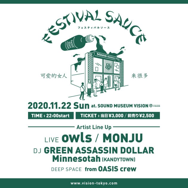 owls、MONJU、GREEN ASSASSIN DOLLAR、Minnesotah(KANDYTOWN)のLIVE&DJ!!