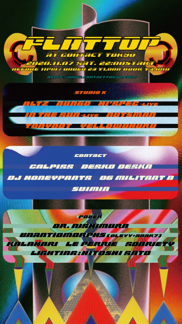 FLATTOP Desko Deskaが案内人を務めるContactフロアではCALPISS、DJ HONEYPANTS 、OG Militant B、suiminといった多国籍の景色を見せながらエレクトリックの効薬を混ぜ込んだ巨大なエネルギーの渦が発生。さらにサプライズは、Foyerフロアでの悪魔の沼 Dr. Nishimura、olevvとadak7からなるEnantiomorphs、Le Perrie、Sobriety、FLATTOPクルー乾針など最高峰のオルタナティブ・サウンドを体験できる。