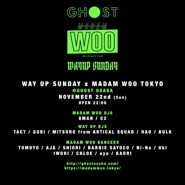 東京・渋谷で話題のジェントルマンズ・クラブMADAM WOO TOKYOがGHOST OSAKAの人気レギュラー・パーティ『WAYUP SUNDAY』に上陸!