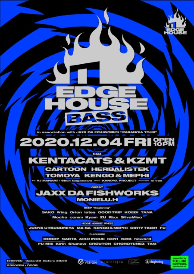 その後、UKハウスとUKベースの影響を受けたJauz、Ephwurd、Sindenといったアーティストたちによって進化を遂げ、AfrojackやOliver HeldensらEDM勢が大型フェスでこぞってプレイすることになり人気ジャンルとして確固たる地位を築いた。というのが起源ではあるが、実際にはBASS MUSICを軸にしたものやFUTURE HOUSEを軸にしたものなどへの派生は止まっておらず現在も広がりを見せている。12月のEDGE HOUSEはBASS HOUSEをフューチャー。EDGE HOUSEの解釈におけるBASS HOUSEを中心としたパーティを展開する。