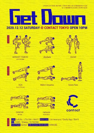As the title, a lineup of uplifting players will make you「Get Down = Dance」. With a mixture of sounds ranging from Disco Dub to House, DISKO KLUBB organizers Monkey Timers leads the pack along with deep and outstanding grooves by okadada, and AKEMI making her debut in Studio X. Contact floor features none other than KZA from Force Of Nature and Tokyo’s finest, funkiest, long-lasting members of the deep underground. Rooted in House, Tsubaki FM’s founder Midori Aoyama covers a wide range including Jazz and Broken Beats. Souta Raw, always bringing the funk to the dance floor of his weekly Tuesday party at Aoyama Tunnel, and SANCHE from the now defunct party shaman joins the lineup. In addition, the young and educated natsumi will be warming up the dance floor with his full spectrum of World music. In Foyer floor, a group of members from Ikebukuro/Shinjuku area will be spicing things up with live beats and Hip Hop MC for a different approach with a different BPM for you to Get Down to. The first and last, happy and funky, the best of the year party to let yourself go to the grooves and dance the night away. Let’s Get Down!