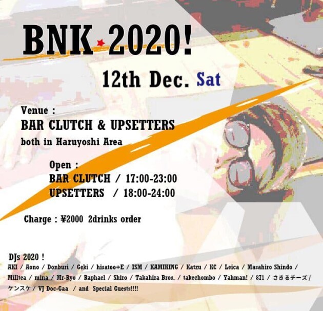 Date :2020.12.12.sat Venue:BAR CLUTCH & UPSETTERS Open: BAR CLUTCH / 17:00-23:00 UPSETTERS / 18:00-24:00 Charge:¥2,000 + 2drinks order