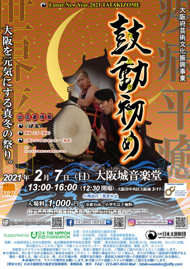 "Tatakizome" is the lunar new year festival, where you can listen to the powerful sounds of the"TAIKO" Japanese drum performance ,and feel the beat of the heart which is the rhythm of your own life and we all rejoices in the benefits of nature and the renewal of life!
