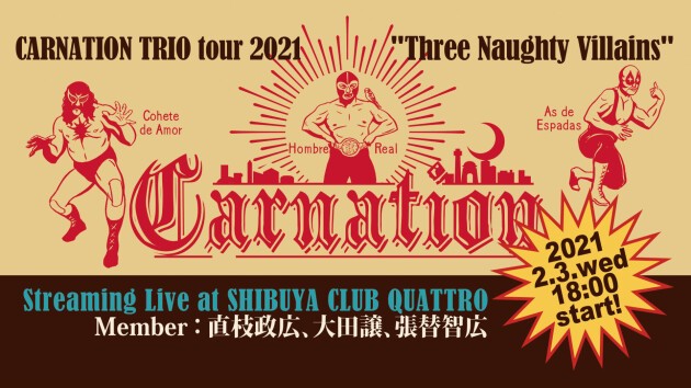 昨年4月に開催予定だったカーネーションのトリオツアー "Three Naughty Villains" 振替公演の東京公演をストリーミング配信します!トリオだけのツアーは約10年ぶり。シンプルでありながらとてつもなくロック。やんちゃな三人の悪漢、カーネーションのステージをぜひお楽しみください。