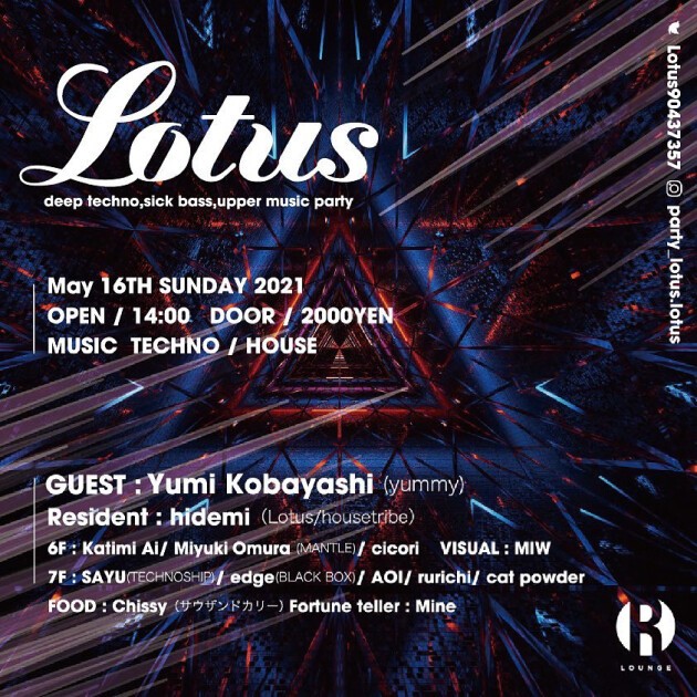 Lotus 2021.5.16 sun 14:00〜20:00 @R lounge 6F/7F genre:techno/house entrance:¥2,000 w/f:¥1,500