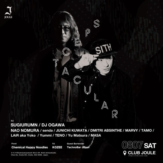 緊急事態宣言の発令により延期となっていたJOULEのTECHNO PARTY "SPECTACULAR" が8.7satに開催決定!MAIN ROOMにはBASS WORKS RECORDINGSを主宰し、7枚のオリジナルアルバムを発表し、シングルも世界各国のレーベルよりリリースするSUGIURUMN。名古屋を拠点に自らのサウンドを世界へと発信し続ける日本屈指のプロデューサー DJ OGAWA そして、関西シーンを牽引するDJ達による一夜をお楽しみください。