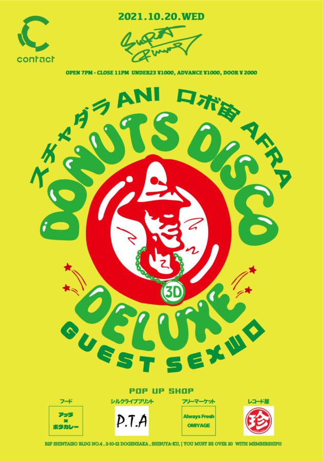 スチャダラパーANI、ロボ宙、ヒューマンビートボクサーのAFRAからなるユニットDONUTS DISCO DELUXE。70年代当時ブロンクスで行われていた野外パーティ“ブロックパーティ”のライヴ感や熱量を現代にアップデートしてきた。フジロックなどの野外フェスから日本独自のブロックパーティである盆踊り迄、音が鳴らせる場所なら何処へでもヒップホップ、ソウル、ファンク、ディスコを軸に、DJ/MC/ヒューマンビートボクサーと3人3様の芸当を畳みかけるように繰り出すそのスタイルは、音楽やパーティ本来の楽しさを教えてくれると共に、他にはない独自のパーティ感を作り出している。毎回のスペシャルゲストもさることながら、レギュラーで出店するフード/レコード店/オリジナルドーナツ盤のダイレクトカッティング/シルクライブプリント/アーティストによるレアなグッズ販売店などなど、充実したポップアップもゆっくりと楽しめる。平日の終電までの面白空間で遊び尽くそう!