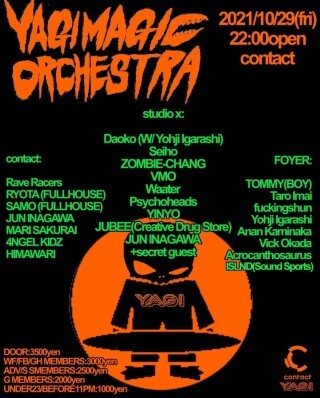 Contact初登場となるDaokoとZOMBIE-CHANGのラインナップはこの日描かれるYAGI MAGICAL ORCHESTRAを飛翔させる大きな仕掛けになっている。Daokoの鮮やかなエレクトロニクスをもちいた音遊びと、高い感度で連動させる言葉遊びはリスナーの脳を激しく攪拌している。米津玄師や岡村靖幸との共演からもわかるように、メジャーフィールドから、テクノやエレクトロニカを好むコアな電子音楽ファンをも魅了している。FUJI ROCK FESTIVALへの出演、北京、上海、台北、香港のアジアツアー、UK〈Toothpaste Records〉レーベルからのリリースなどZOMBIE-CHANGを取り巻く状況は昨今非常に活発になっている。どこかメランコリックなラップに、ローファイかつマッドなエレクトロニクスの対比がもたらす中毒性に現行シーンが依存を起こす事態となっている。さらには、テクノ、ブラックメタル、インダストリアル、ノイズにライヴ・ヴィジュアルが渾然と交わるポスト・レイヴシーンの旗手、大阪に生まれた巨大なカオスVMO a.k.a Violent Magic Orchestraのラインナップも決まった。この異空間を実体化するうえで、Seihoの複雑かつ緻密な音楽性と、明らかな現実世界とのずれの愉楽は、欠かすことはできない。際立って光るラッパーJUBEEや彼のプロジェクトRave Racers、9月のY5で想像を超える親和性をみせたSPEEDからクルーの強い個性となるバンドWaater、Psychoheads、そして、YAGIファンへのビッグなギフトとなるシークレットゲストも楽しみにしてほしい。