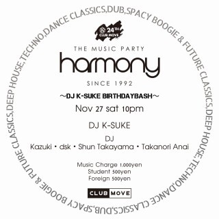 92年よりスタートした自身がオーガナイズするMUSIC PARTY「HARMONY 」(現在CLUB MOVEにて毎月最終土曜日に開催) は、来年で30年目を迎え、多彩なゲスト陣のPLAYはもちろん、K-SUKE自身のOPEN MINDなルーツから繰りだされるNYダンスミュージックスピリットを受け継ぐジャンルを越えたGOOD MUSICを自在にMIXするスタイルが、多くのクラウドを惹きつけ続けている。