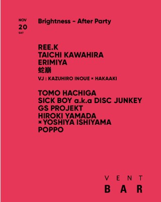 2021年の春、そして秋の二度にわたり川崎のちどり公演で野外フェスティバル“Brightness Open Air”のアフターパーティーが今回もVENT BARで開催される。KEN ISHII、HIROSHI WATANABE a.k.a KAITO、DJ YOGURTといった豪華な顔ぶれと共に、野外公演にも出演したRee.Kがこの日のアフターパーティーにも、ヘッドライナーとして登場する。80年代半ばから音楽制作を始め国内外でのリリースを重ねたのち1992年からDJとしての活動をスタートし、その後も現在まで独自の世界観を持つ作品のリリースとオリジナリティー溢れるDJスタイルで強烈な音楽体験を与え続けている Ree.K のプレイに注目して欲しい。