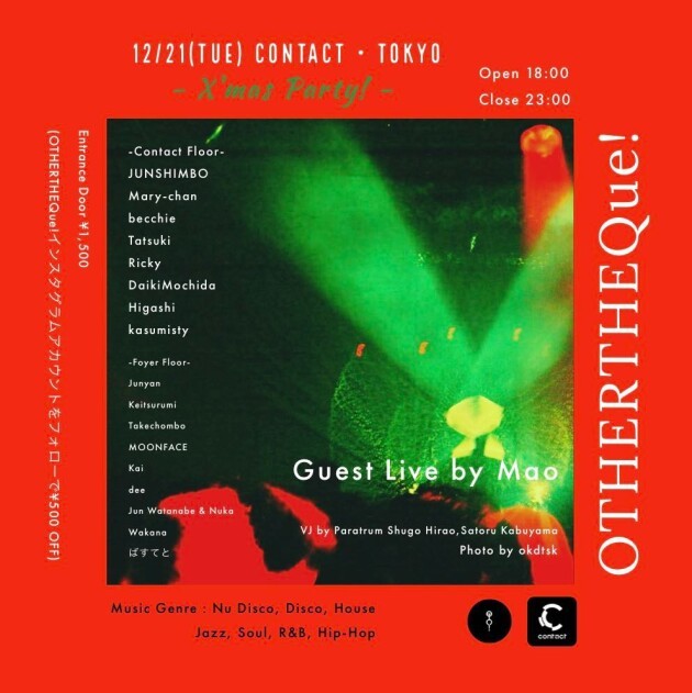 After 1 year and 10 months, known for their wild nights with guests Patawawa, Young Franco, Jerry Folk, they return to Contact. Since the party began, they have invited artists like Jafunk, Sandboards, Jonna, and Vanessa Wormfor their Japan debuts, OTHERTHEQue! have been blowing new winds into Japan's Nu Disco/Indie Dance/Alternative House scene.