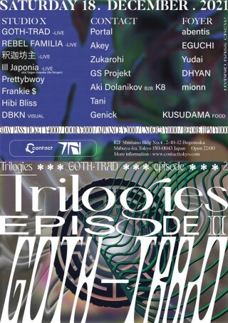 GOTH-TRAD, the pioneer of dubstep, appears for the December edition of the resident series Trilogies. In 2005, dubstep was on the rise and already in the midst of globalizing the scene. GOTH-TRAD was the first to bring the same intense vibe from its birthplace to Japan.