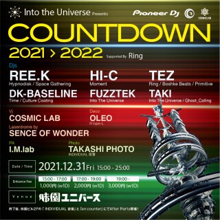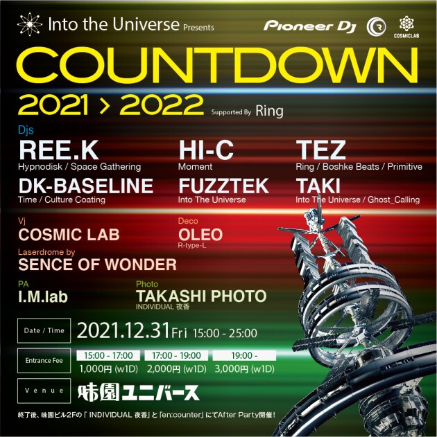 サウンド、ヴィジュアル、レーザー、デコレーション、光、造形、そしてその「経験」が織りなすスペシャルな空間と、 それら各分野を代表するパーティーオリジネーターが年末カウントダウンユニバースに集結!