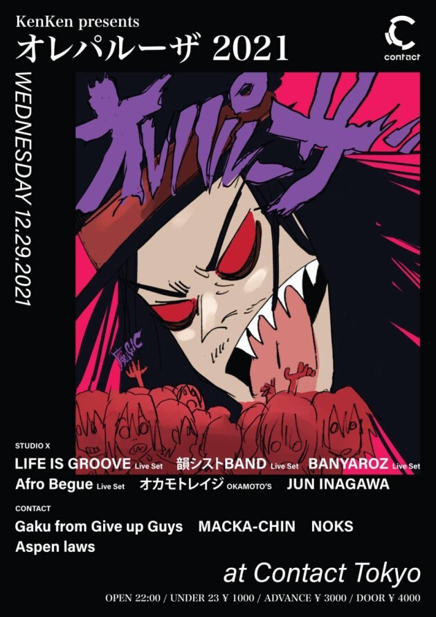 KenKen's customary end of the year birthday festival オレパルーザ (OLE PALOOZA) to be hosted at Contact for the first time! Every year, tickets sell out immediately, but due to the pandemic he instead did a streaming last year titled「今年は家パルーザ」with no audience. The sessions with Tatsuya Nakamura of BLANKEY JET CITY, trumpet player TOKU, dancer atsushi, and Taiji Sato, the frontman of THEATRE BROOK, brought him closer to his fans. KenKen, in full throttle mode like his previous events with a strong lineup, leads the audience into a crucible of enthusiasm where people dance and float in the air.