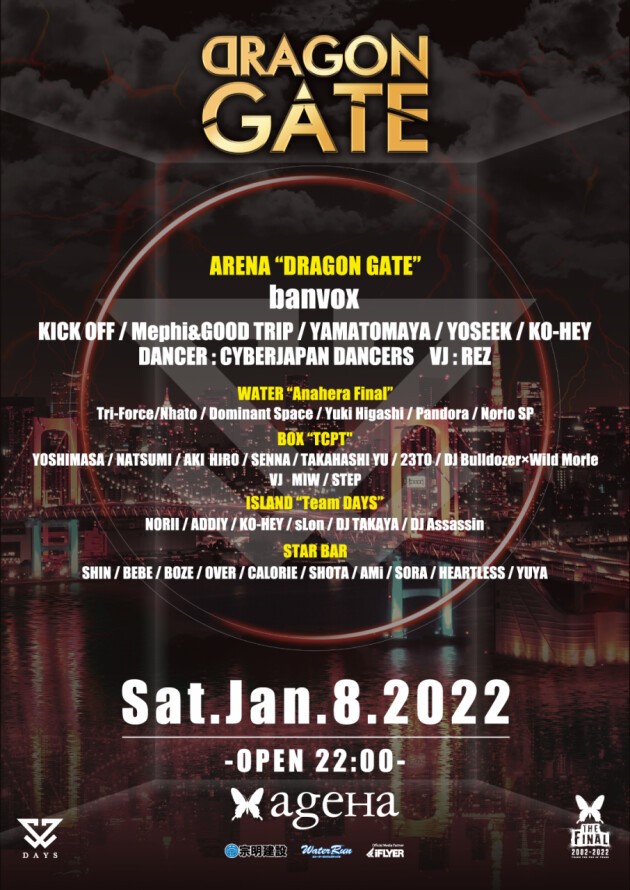 数々のビッグパーティーを仕掛けてきたDAYS主催の"DRAGON GATE”、ageHaでの最後のオールナイトパーティー!!