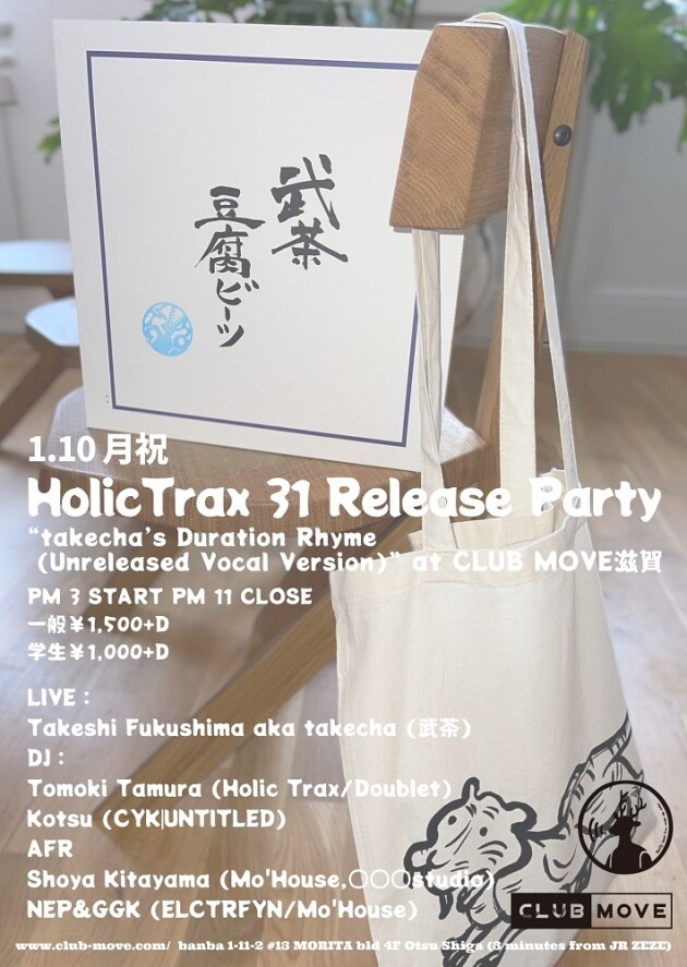 ベルリンを拠点に活動する日本人DJ / プロデューサー・Tomoki Tamuraが主宰するレーベル "Holic Trax" から31番目のリリース "Takecha"「Duration Rhyme」の発売を記念してのリリースパーティーが滋賀で開催。