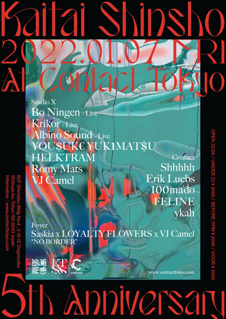 Kaitai Shinsho began in January of 2017 in the underground basement of Daikanyama under the leadership of Romy Mats and VJ Camel. In their 2nd year, they based the foundation for their activities at Contact Tokyo. And now, they celebrate their 5th anniversary. January 7th marks a turning point, a point of new departure, for the two organizers to tackle their recurring thought of "facing the future by going back to the basics". Romy and Camel, both reflecting on the very essence of "Kaitai-Shinsho", their own individual activities, their pilgrimage in music, invites artists they wish to collaborate with in the future for their 5th anniversary party.