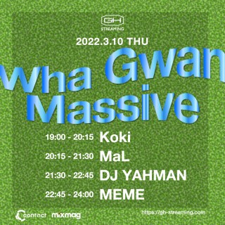 For this stream, we'll be taking you back to the first party of Wha Gwan Massive at Contact that took place on 2/9. Experts MaL from PART2STYLE and DJ YAHMAN, who organizes Tribal Connection, gathered under Aoyama's key man ROUSH.