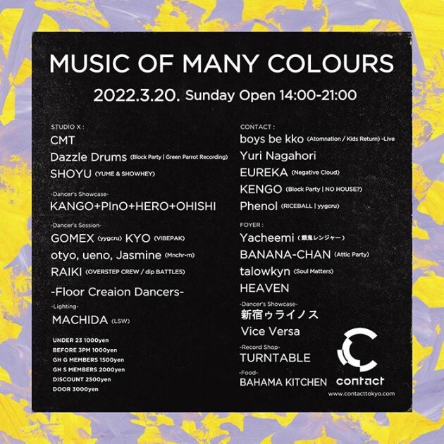 Music Of Many Colours, the party hosted by Dazzle Drums that focuses on House Music where DJs and dancers bring out their individual expressions to stimulate one another. For their 15th installment, they go back to their roots and go full force with the House sounds. Studio X will be featuring CMT, a figure entrusted by fans and peers, YUME & SHOWHEY’s unit SHOYU, both veterans with a 20 year career. Dance showcase by KANGO+PInO+HERO+OHISHI, and Dazzle Drums improv Dancer’s Session with Lockin’ × House as this edition’s theme. In addition, we have GOMEX, KYO, Jasmine, otyo, ueno, RAIKI, and FLOOR CREATION DANCERS will be creating an「organic dance floor」, a distinct characteristic of this party.