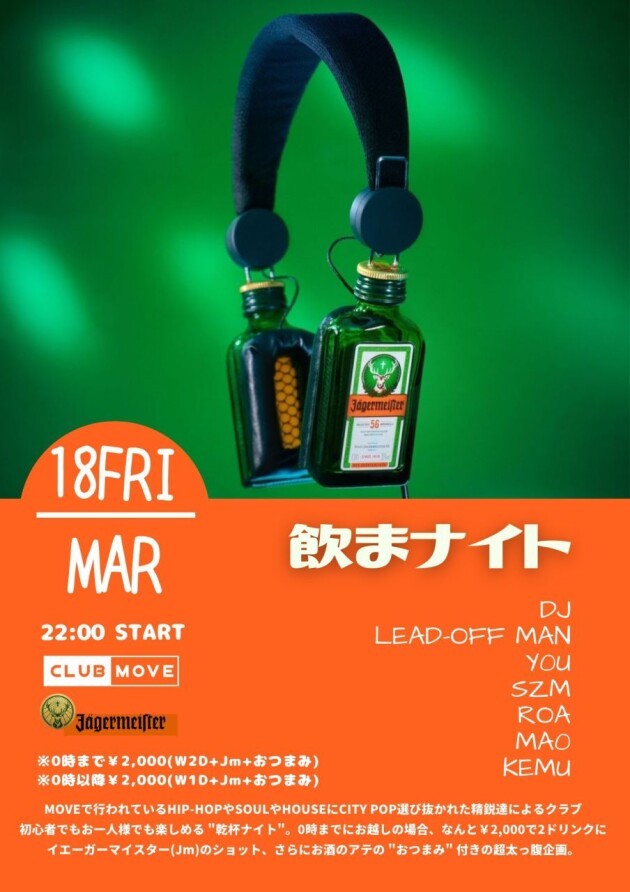 MOVEで行われているHIP-HOPやSOULやHOUSEにCITY POPのイベントから選び抜かれた精鋭達によるクラブ初心者でもお一人様でも楽しめます。