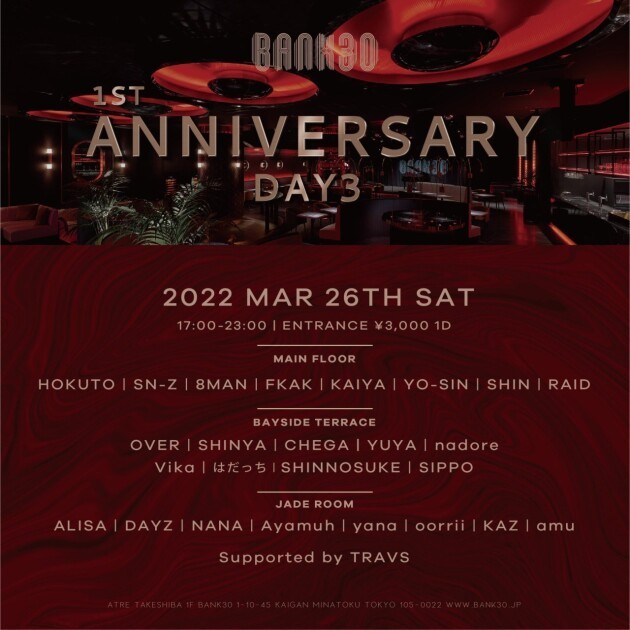 DAY3は、東京はもちろん日本のみならず世界でも活躍するDJから、これからのCLUB業界を担う若手DJまでが勢揃い。MAINフロア、普段はVVIP ROOMとして使用されているJADE ROOM 、東京湾を一望できるBAYSIDE TERRACEの3フロアで展開。タイトルBANK30 1ST ANNIVERSARY DAY3