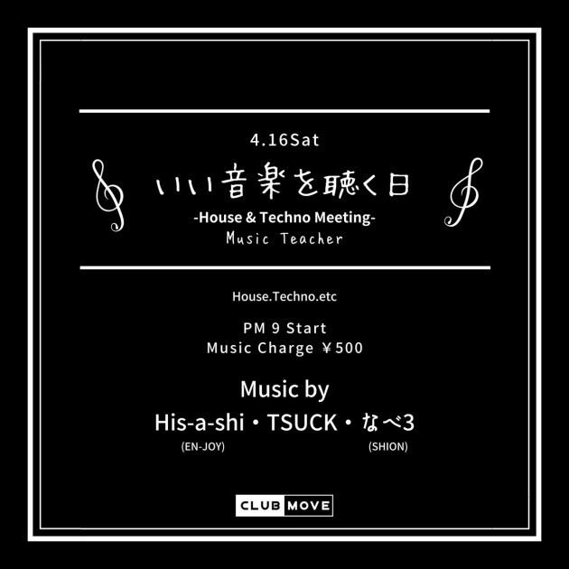 この日はMOVE界隈の様々なDJ達が週末営業の音楽を担当します。 4/16(土) いい音楽を聴く日 -House & Techno Meeting- (HOUSE,TECHNO etc) PM 9 START MUSIC CHARGE¥500 MUSIC by His-a-shi (en-JOY) / TSUCK / なべ3 (SHION)
