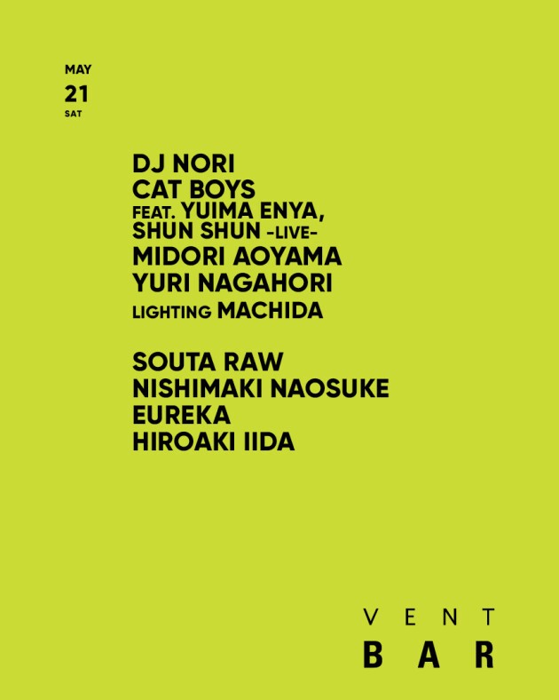 加えて、渋谷発 “午前3時のラウンジファンクバンド” CAT BOYSがTAM TAMでお馴染み三茶のディーバYuima Enyaと、”今夜は最高”で有名な湘南のギターヒーローShun Shunをフィーチャーしライブを披露する。また、自身がフロントマンを務めるパーティーEureka!を2012年にスタートし、海外でもアムステルダムのClaire、マジョルカのGarito Cafeなどのハウスシーンの名門クラブでもプレイし現在はレーベル“Eureka!”とインターネット・ラジオ局TSUBAKI FMを通して活動を続けるMidori Aoyamaが登場。オープニングはNYハウスをベースに幅広く選曲するYuri Nagahoriが務める。