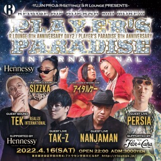 R LOUNGE 9TH ANNIVERSARY、2日目となるこの日は人気レゲエダンスPLAYER'S PARADISEの8周年とのコラボレーション! ジャパニーズレゲエのレジェンドDeeJay、NANJAMAN、人気レゲエシンガーTAK-Zなどが登場!