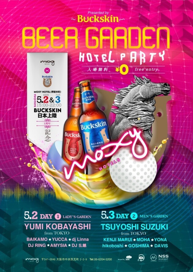 年齢制限無しの入場無料の「ホテルクラブパーティ」に、東京から国際的に活躍する DJ & ARTIST の代表格、Tsuyoshi Suzuki と Dj Yummy - Yumi Kobayashi の二名が来阪し、世界標準のダンスミュージックと、挑戦心に光を灯すビール Buckskin 柏克金啤酒 をビアガーデンスタイルで楽しんで頂ける至福の二日間。