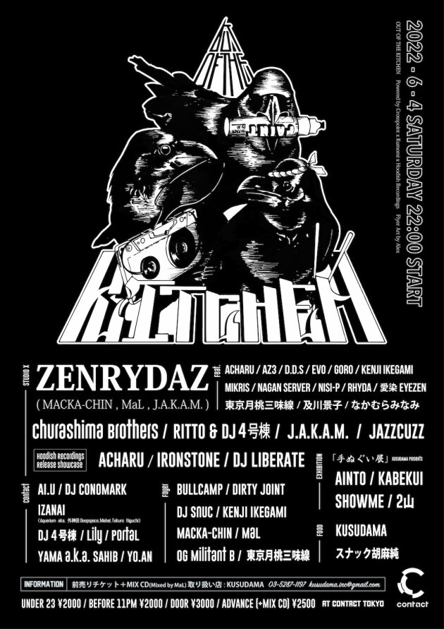For this occasion, they welcome ZENRYDAZ (MACKA-CHIN, MaL, J.A.K.A.M.) to Shibuya Contact featuring various artists for rare live sets under the support of 3 labels〈Crosspoint〉, a newly founded label focusing on world music, 〈Hoodish Recordings〉, and the made in Japan〈Kumomi〉along with RITTO & DJ 4号棟 and Churashima Brothers from Okinawa. Hailing from Shonan area we have DIRTY JOINT, recently released their 2nd album, DJ Yama a.k.a. Sahib of JazzBrothers who’s been active since the early days of Tokyo’s club scene, DJ CONOMARK, IZANAI, YO.AN, and DJs active nationwide will be gathering at Contact.