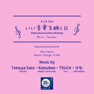 この日はMOVE界隈の様々なDJ達が週末営業の音楽を担当します。 5/14(土) いい音楽を聴く日 -Deep House & Disco Meeting- (DEEP HOUSE,DISCO,BOOGIE,SOUL etc) PM 9 START MUSIC CHARGE¥500 MUSIC by Tetsuya Sato (Round) / Katsubee (BIWAKO JAPAN/TIME) / TSUCK / けむ (NEW ORDER)