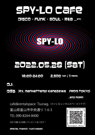 2022年5月... SPY-LO CAFEが富山市「cafe&rentalspace カフェ&レンタルスペース Tsunag.(ツナグ)」で決定っ! DJは 1980年代 金沢片町 MANHATTAN21 のチーフDJを務め、今も全国で活躍する OSA。