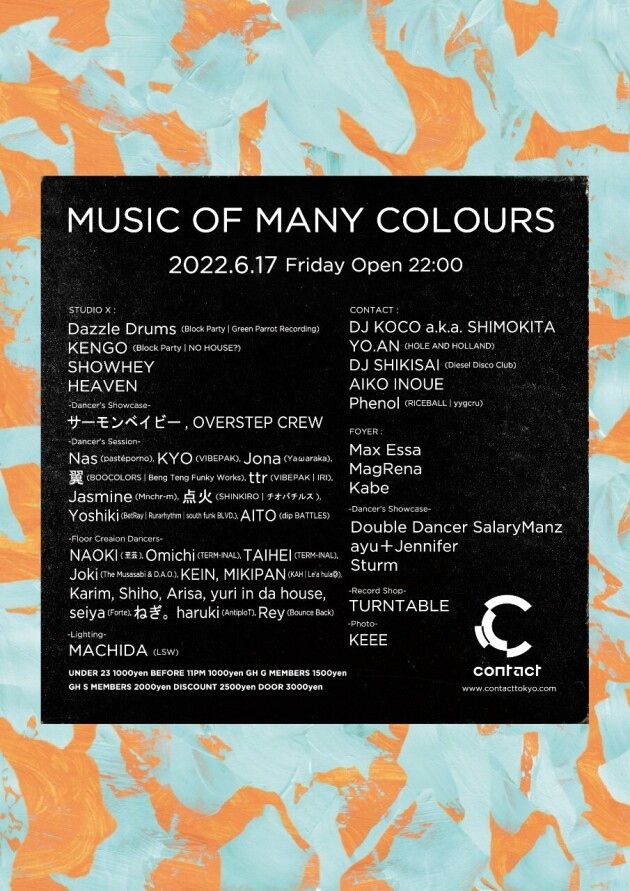 Dazzle Drumsが主催する、ハウス・ミュージックを軸にDJとダンサーがそれぞれの個性を表現し合うパーティ、Music Of Many Colours。2017年からコロナ禍においても立ち止まることなく開催を続けてきたが、第16回目のこの日がContactでの最後の開催となる。